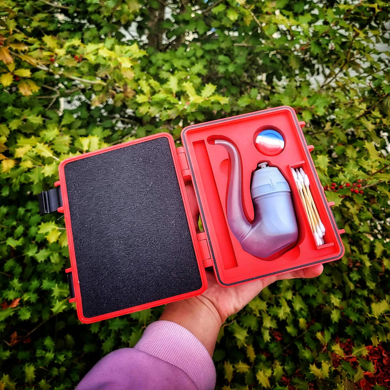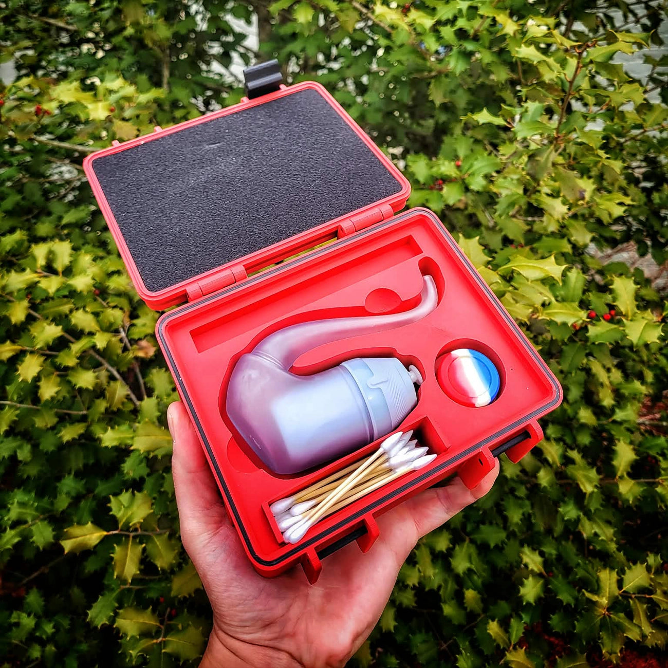 3D-printed hard shell engineered for daily carry. Custom-molded holder for the stock Proxy glass. Dedicated compartments for a jar, cotton swabs, and a hot knife. TPU seal for water resistance and odor control. Internal foam padding for shock protection. Clean profile. Tight tolerances. Reliable closure. Built for travel and daily use.